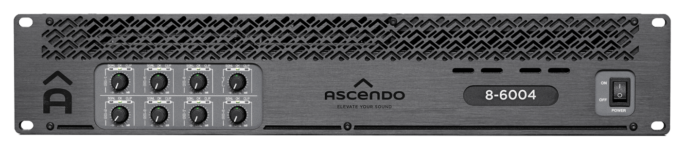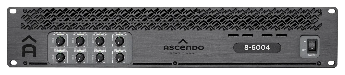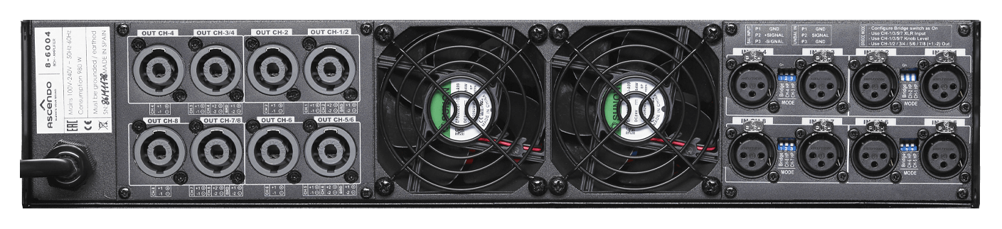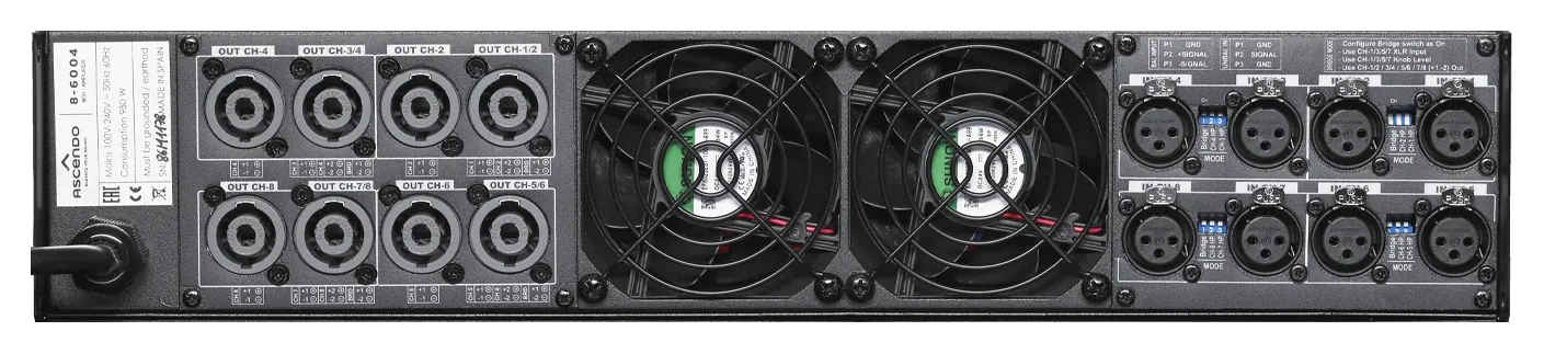 230 V @ 4 Ω: 8 x 750 W 230 V @ 8 Ω: 8 x 400 W Bridged: 230V @ 8 Ω: 4 x 1500W