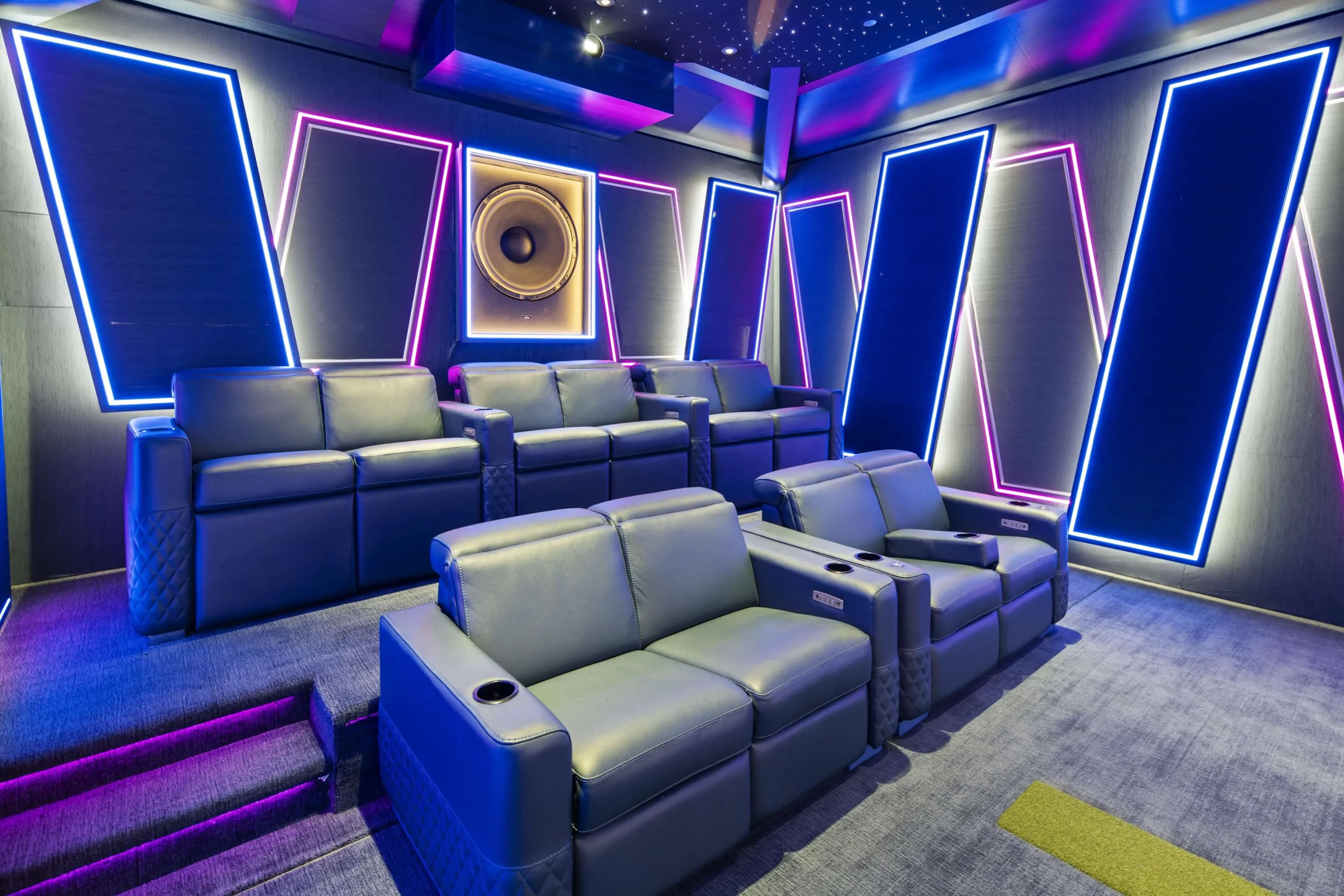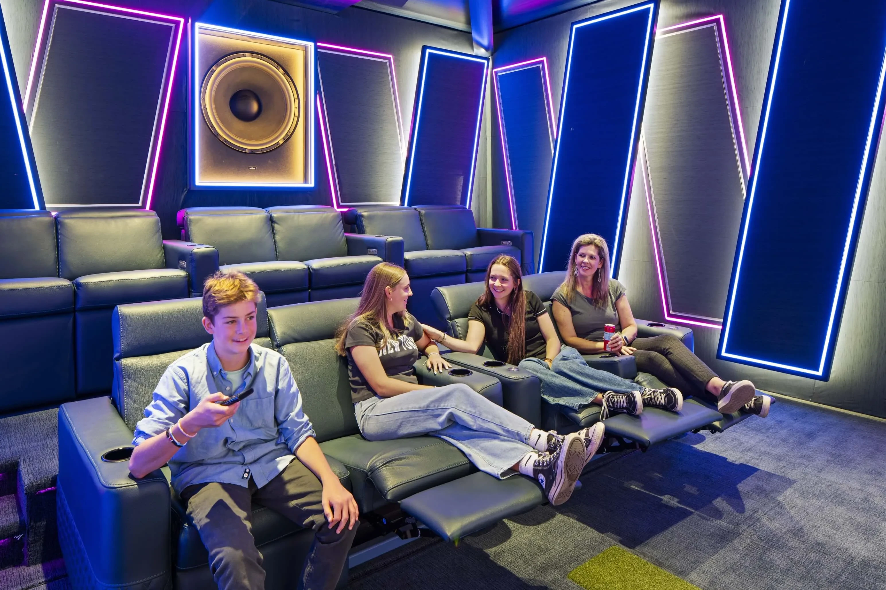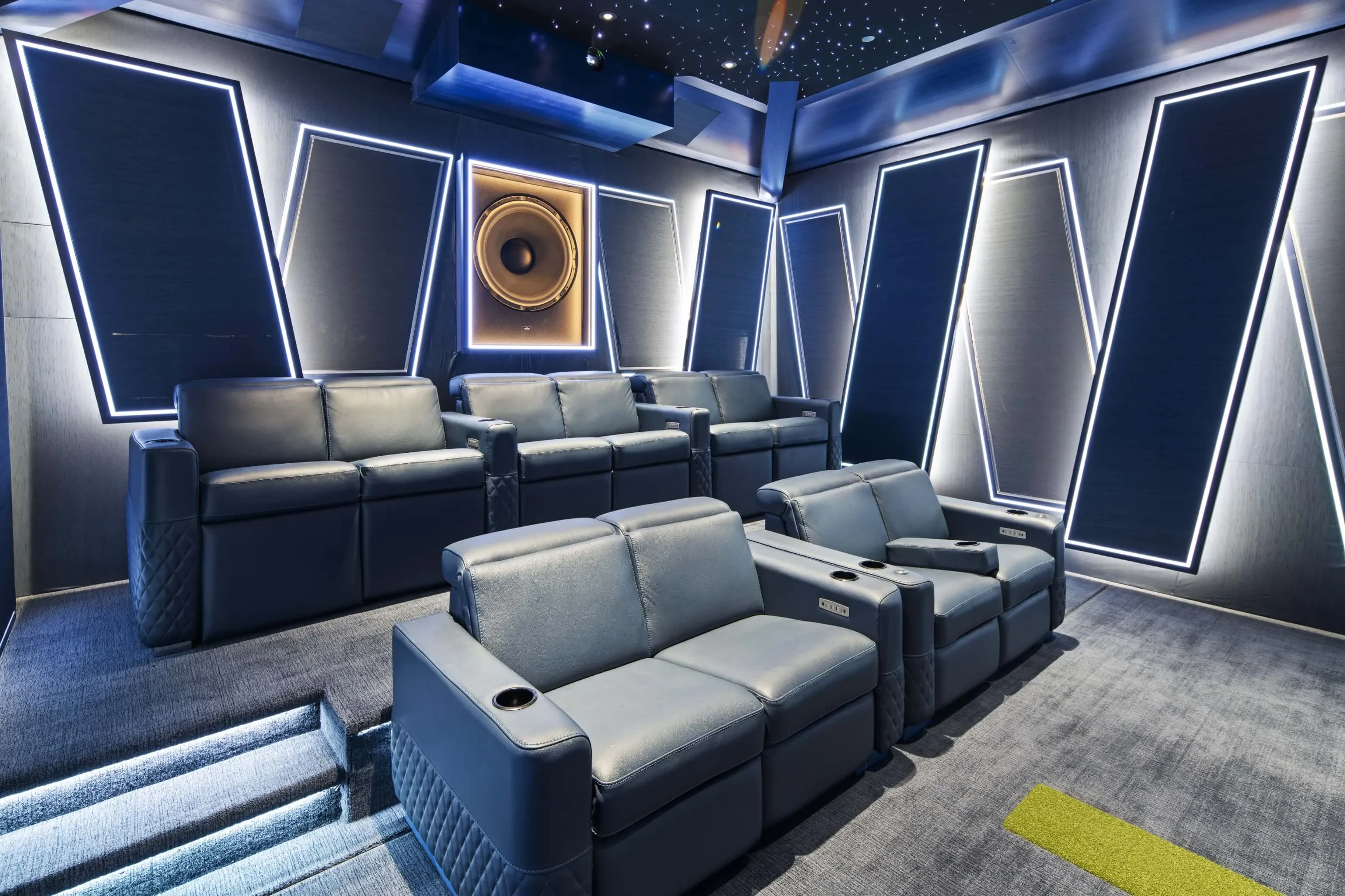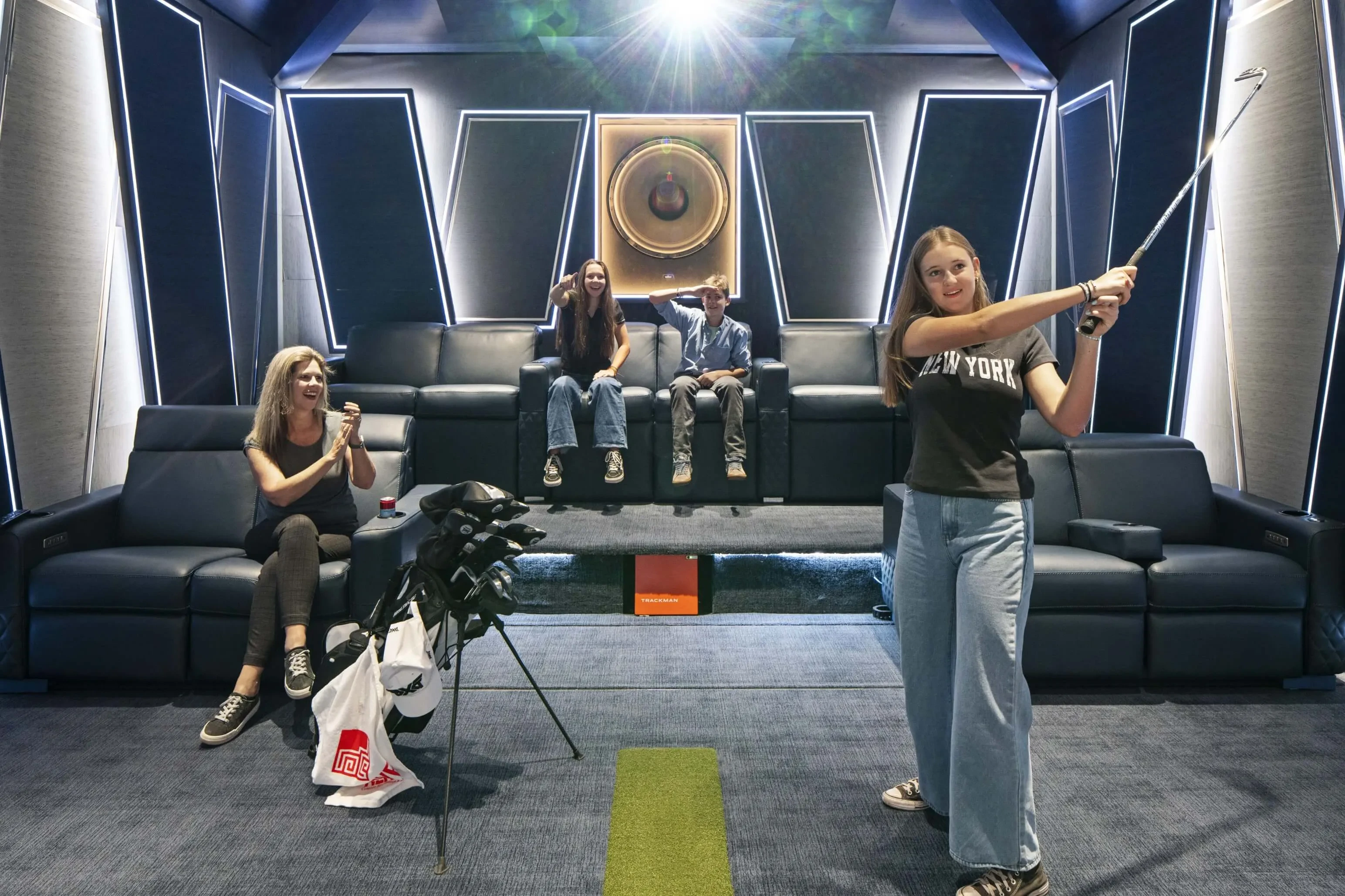 Nerve Park City transforms a garage into an ambitious theater and golf simulator, complete with an 11.5.6 immersive audio system with infrasonic bass from ASCENDO that meets RP22 audio standards.