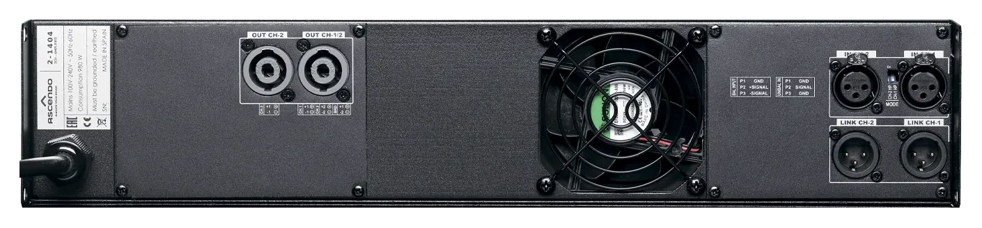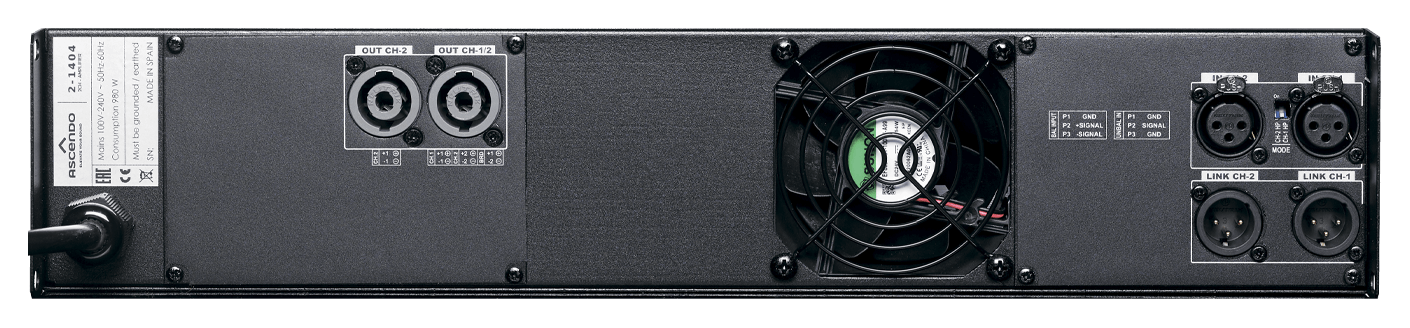 230 V @ 4 Ω: 2 x 700 W 230 V @ 8 Ω: 2 x 375 W Bridged: 230 V @ 8 Ω: 1 x 1400 W