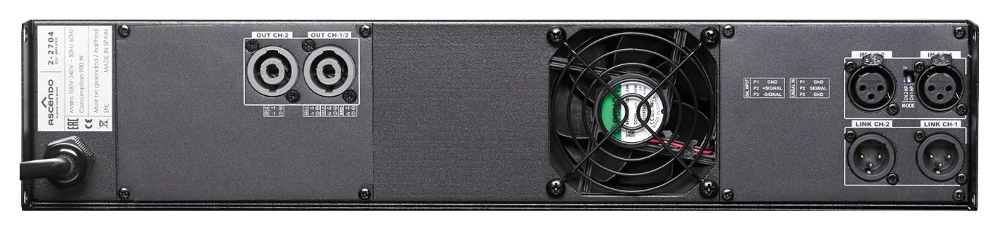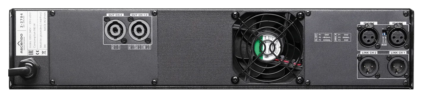 230 V @ 4 Ω: 2 x 1350 W 230 V @ 8 Ω: 2 x 900 W